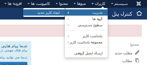 ۱- ابتد از بخش مدیریت جوملا / منوی کاربران / گزینه مدیریت بر روی زیر منوی ایجاد کاربر جدید کلیک کنید.