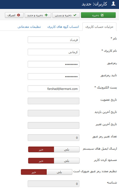 ۲- سپس یک کاربر جدید با هر اطلاعاتی که مد نظرتان است بسازید و بر روی دکمه ذخیره و بستن کلیک کنید.