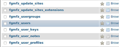 ۵- در سمت راست صفحه جداول دیتا بیس ها به شما نمایش داده می شود به پایین صفحه بروید و در اواخر صفحه جدولی با نام _users را پیدا نموده و بر روی آن کلیک کنید. توجه: نوشته قبل از خط زیر پیشوند نام دارد و در هر سایتی متفاوت است به عنوان نمونه در سایت ما این پیشوند fgmfz است و در سایت شما حتما چیز دیگریست. اما چیزی که شما باید به آن اهمیت بدهید کلمه بعد از خط زیر یا آندرلاین است و آن هم کلمه users است.